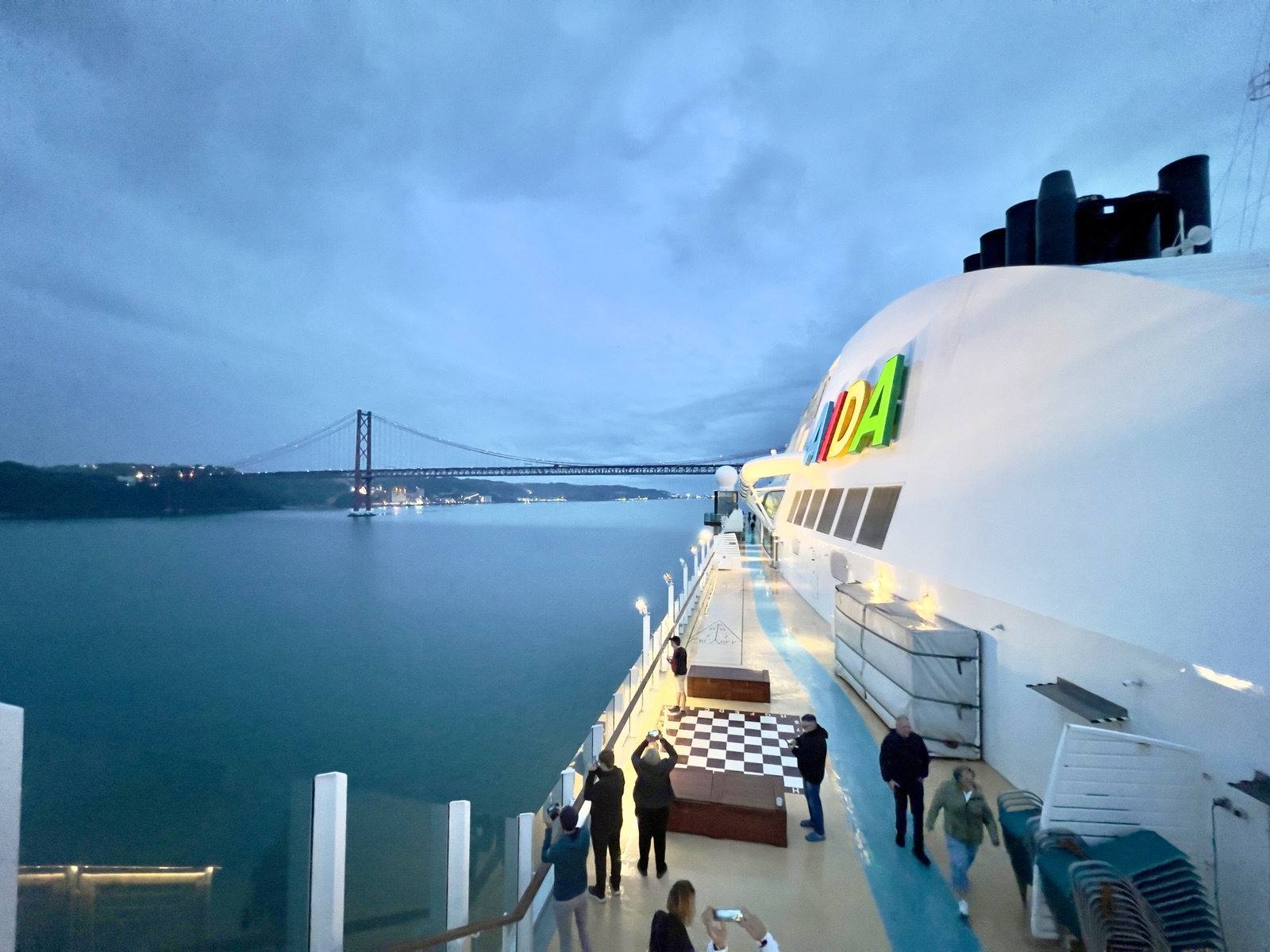 Der Tagesplan sah vor, dass die AIDAprima gegen 8.00 Uhr am Liegeplatz festgemacht hat und für die Landgänge freigegeben ist. Vorab durchfährt das Schiff den Tagus um dann unter der „Brücke des 25. April“ durch zu fahren.